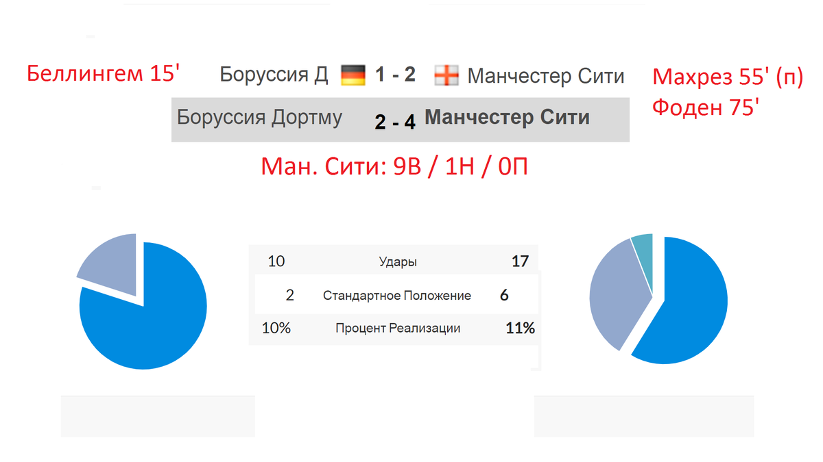 У хозяев поля самую высокую оценку за матч получил де Брюйне (8). За последние 10 лет клубы провели 7-ю встречу, одержав по 3 победы. Посмотрим статистику. У команды Терзича было 10 ударов, у подопечных Гвардиолы на 7 больше. Первый коллектив исполнил 2 стандартных положения, второй – 6. Реализация моментов 10 и 11 процентов соответственно.
