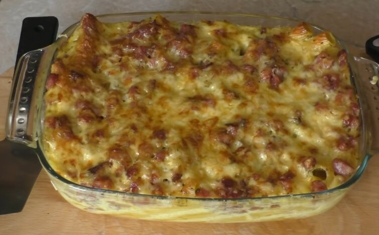 Теперь берем наши макароны с ветчиной и заливаем яйцами с молоком.