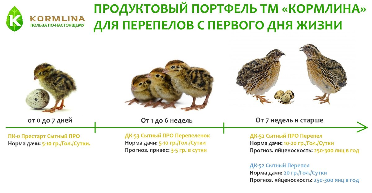 Интенсивный рост молодняка и высокая яичная продуктивность самок проявляются при условии обеспечения их кормами, содержащими все необходимые питательные вещества: белки, углеводы, жиры, микроэлементы и витамины. Рацион для перепелов должен соответствовать природным особенностям этих птиц, охотно ими поедаться и не вызывать нежелательных последствий. Для решения этих задач в современных хозяйствах любого масштаба преимущественно используются комбикорма. О них и поговорим...Но для начала отметим, что мы производим комбикорма для всех возрастов домашней птицы. Такой подход позволяет предлагать нашим покупателям не точечные решения, а комплексы, так называемые программы кормления. Начнем с самого начала, с момента рождения птенца.