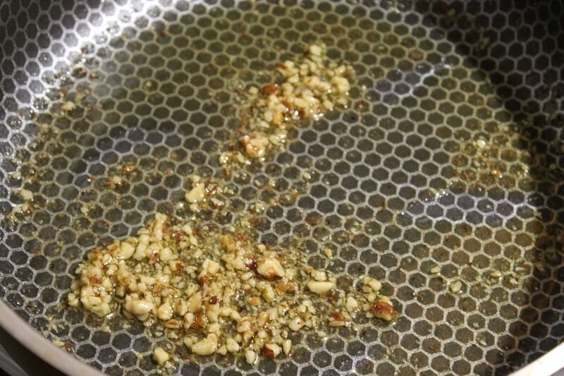 Спагетти ставим вариться и пока они там булькают занимаемся панчеттой грецкими орехами. Орехи наемного измельчаем в ступке и поджариваем на сковороде с оливковым маслом.
