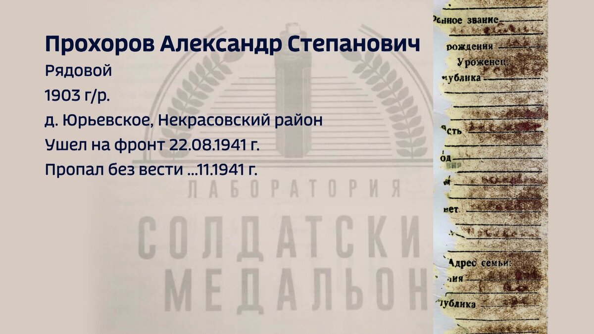 Ищем родственников красноармейца. Смоленским поисковикам под Вязьмой удалось обнаружить останки солдата. И большая удача - медальон. Прочесть записку удалось лишь в лабораторных условиях. Выяснилось, что медальон принадлежал Прохорову Александру Степановичу, пулеметчику, 1903 года рождения, уроженцу деревни Юрьевское Некрасовского района. Ушел на фронт 22-го августа 41-го. В ноябре этого же года