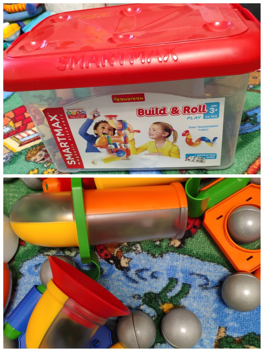 Начиная с 6 месяцев, дети очень любят что-то куда-то заталкивать. А если это что-то ещё и мячик, который покатится-покатится да и выкатится откуда-то, то это просто восторг! Однако до 3-х лет ребёнок очень любит всё тянуть в рот, поэтому размер шариков должен быть больше его рта. Мы нашли такую игрушку, которая удовлетворяла бы потребности всех членов семьи: Магнитный конструктор Bondibon Smartmax Build and roll. Он состоит из крупных магнитных палочек, железных шариков, толстых трубок и пластмассовых креплений. Для малыша здесь всё безопасно, потому что детали крупные, а магниты намертво впаяны в детали. Ему нравится пускать шарики в трубки и смотреть, как они скатываются. Ещё ему интересно примагничивать и отрывать трубочки и мячики. Так ребенок от полугода до 3 лет может достаточно долго сидеть с этой игрушкой. Ребёнку постарше конструктор тоже пришёлся по душе, т.к. он может строить всякие домики, фигуры и треки. Скреплять трубы, к сожалению, немножко трудно. Они очень тугие. Поэто