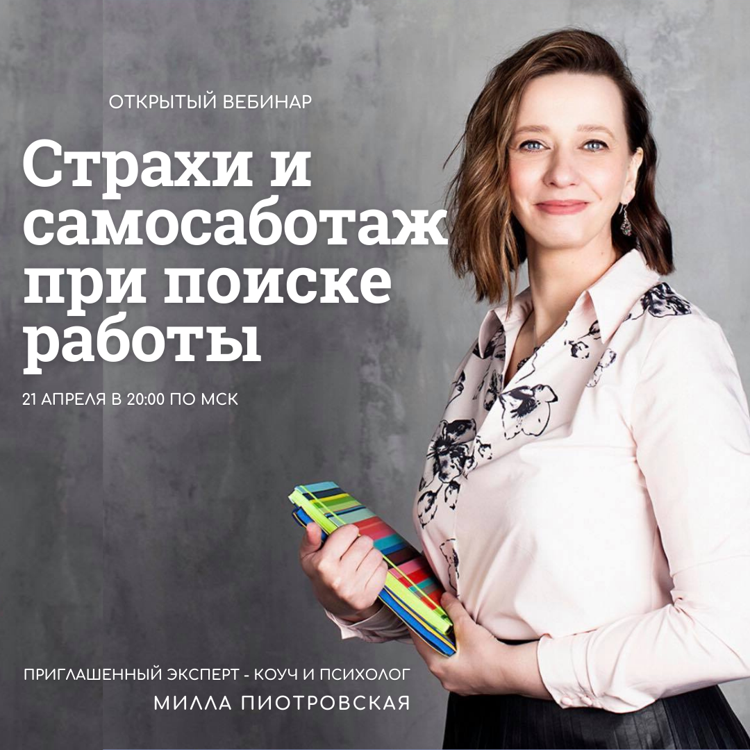 21 апреля в 20.00 по МСК я приглашаю Вас на онлайн-вебинар "Страхи и самосаботаж при поиске работы", который я проведу вместе с приглашенным экспертом - коучем и психологом Миллой Пиотровской.
