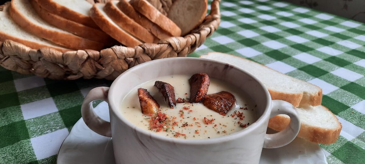 7.Влейте в кастрюлю сливки и доведите суп до кипения.Снимите с огня, разбейте по тарелкам и подавайте.