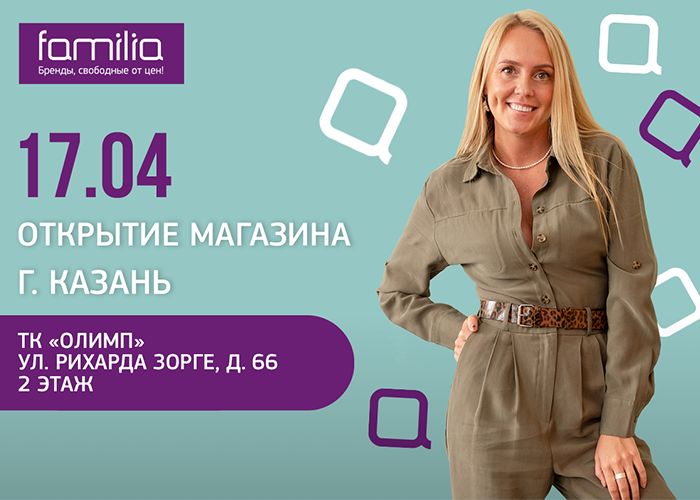 Ждём вас и ваших близких 17 апреля на торжественное открытие нового магазина нашей сети. Он распахнет своих двери в 10:00 в ТК «Олимп», расположенном по адресу: ул. Рихарда Зорге, д. 66. В день открытия вы сможете купить одежду, обувь и другие товары для всей семьи с праздничной выгодой до 85%. Всем желающим вы вручим дисконтные карты Familia с действующей 17 апреля дополнительной скидкой