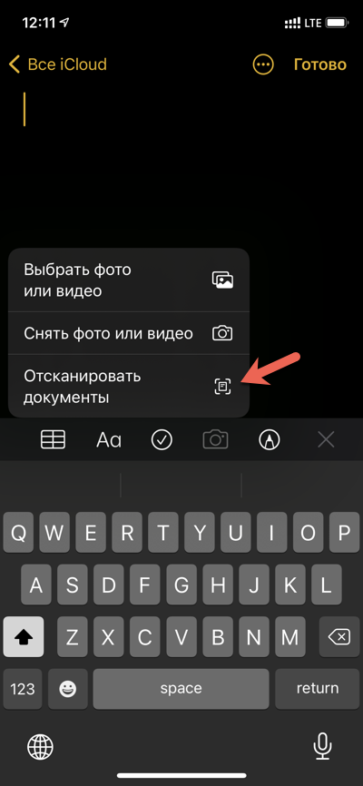 Поскольку у меня iPhone, то чаще всего я пользуюсь именно встроенной функцией сканирования. Она находится внутри заметки. Можно нажать на значок фотоаппарата, а потом добавить изображение или отсканировать камерой документ: