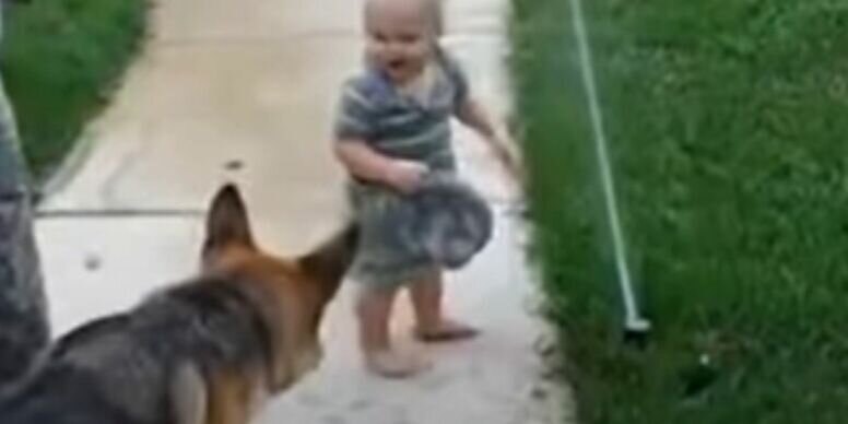Недоглядели родители. Бывает. Но верная немецкая овчарка бдит в режиме 24/7. Когда дело касается малыша, собака сама «автоматически» переключается в режим особой бдительности.