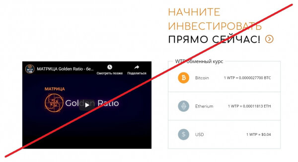 Вот только проекту Golden Ratio гораздо меньше, чем год . Кроме того, нет никакой информации о связи данной площадки с вышеуказанной компанией. А еще нужно сказать, что никакой криптовалюты WTP не существует в природе, несмотря на то, что тут ее представляют как одну из самых перспективных в мире.