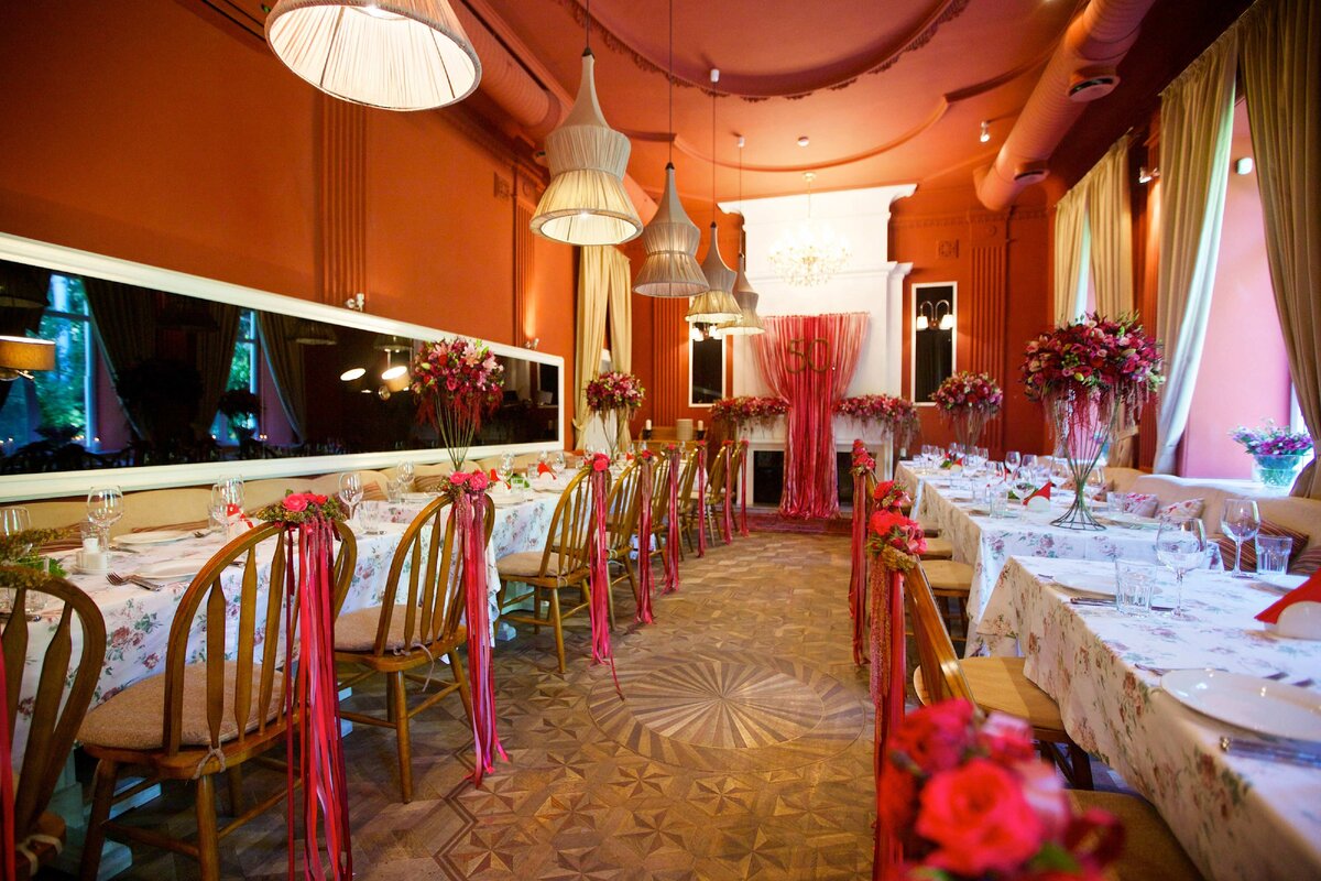 Цвет выбран красный, но это не просто так: цвет задало само помещение ресторана, стены и потолок красного цвета. С такими помещениями у декораторов выбор не большой.