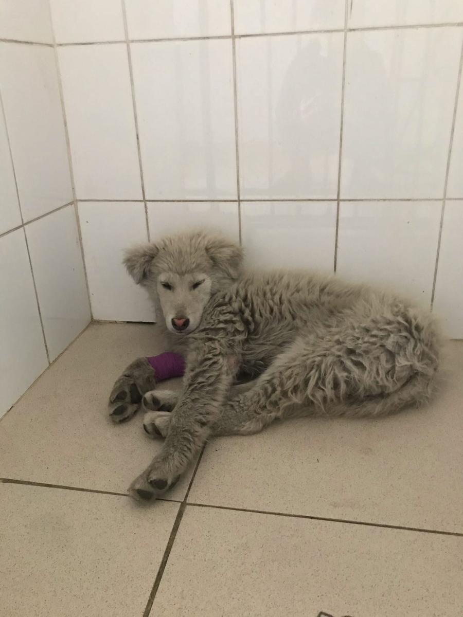 У щенка высокая температура, отказ от еды, частично отсутствует шерсть на шее и лапах и плюс ко всему что-то с лапой, видимо попала под машину. Малышка очень хорошая, как плюшевая собачка.