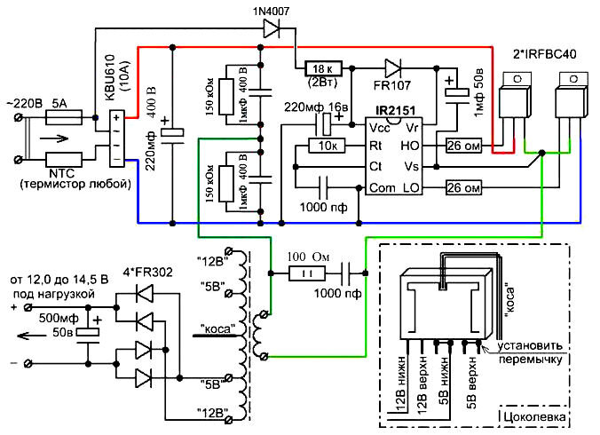 Индуктивность по 25 Вольтам (L) взята от компьютерного БП на 450ватт, лишние обмотки были смотаны - оставляем только те что намотаны толстым проводом.
