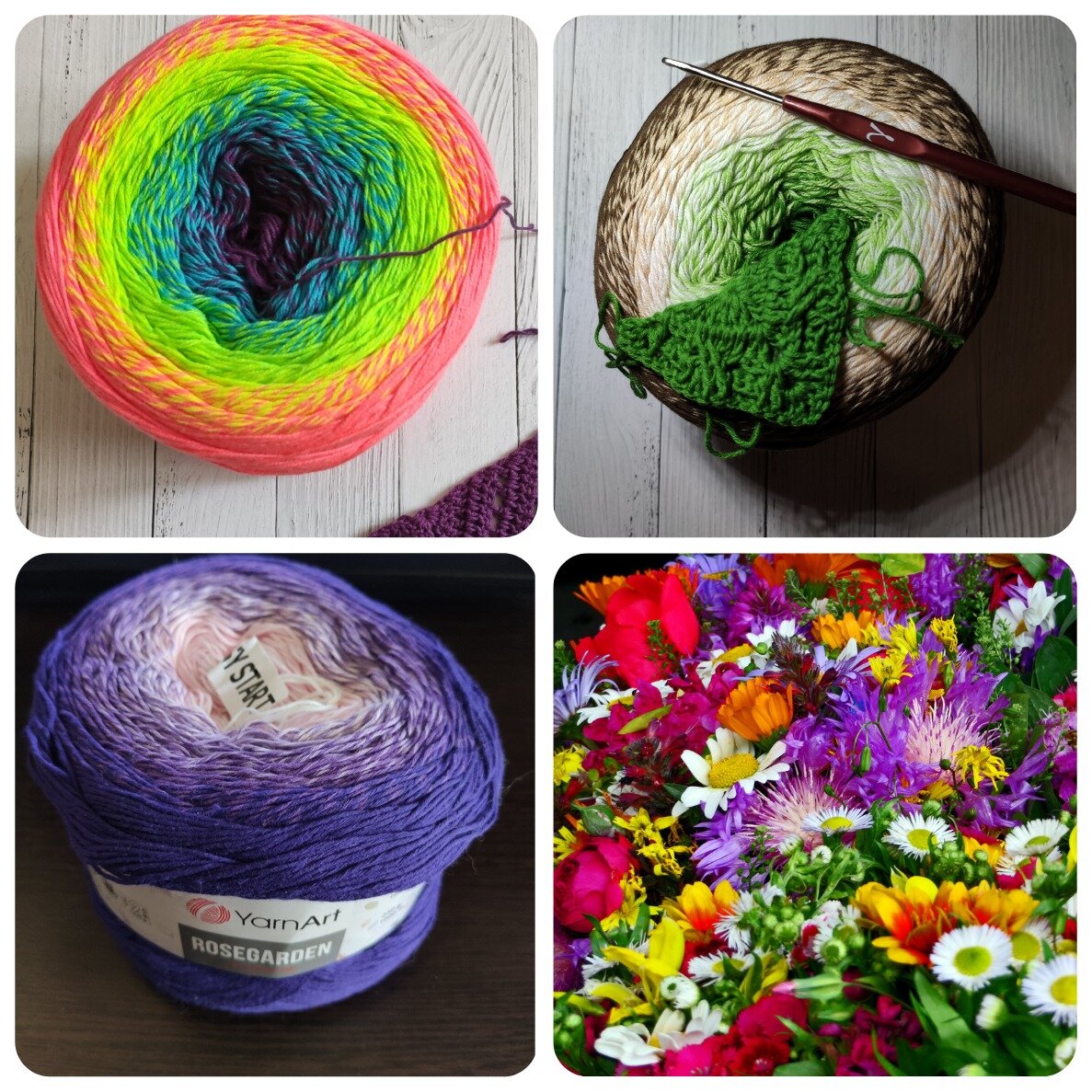" Flowers " и “ Flovers Vivid ” скручены из четырех ниточек, а “ ROSEGARDEN ” – из восьми тоненьких ниточек и поэтому при вязании крючком 3, как указано на этикетке получается очень рыхло и не красиво по крайней мере, мне не понравилось, и я вязала крючком 2,5.