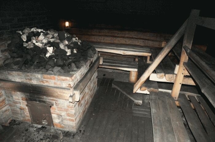 Очаг, обычно, находится на земле, дрова сжигаются прямо под камнями. Дым поднимается к потолку, рассеивается по всей парной и через открытую дверь, окна и щели в стенах, выходит на улицу.