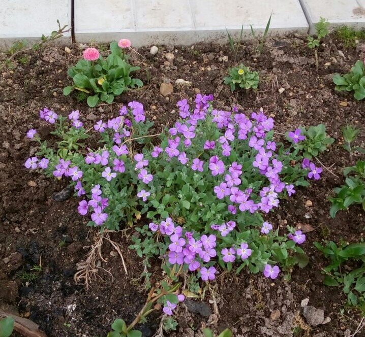 Итак, приступим к тому, что получилось вырастить. Обриета. Интересное многолетнее почвопокровное растение. В литературе пишут, что тяжело всходит и еще хуже пересаживается, поэтому пикировать его не нужно, а лучше сразу сажать в какой-то емкости отдельно. Я так и сделала. Несколько растений взошло и вполне благополучно пересадилось в грунт. Это растение хорошо разрастается, но достаточно хрупкое, чуть заденешь - вянет.