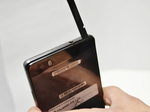Сперва-наперво снимите заднюю крышку Huawei P8 Lite , прибегнув к помощи черной палки.