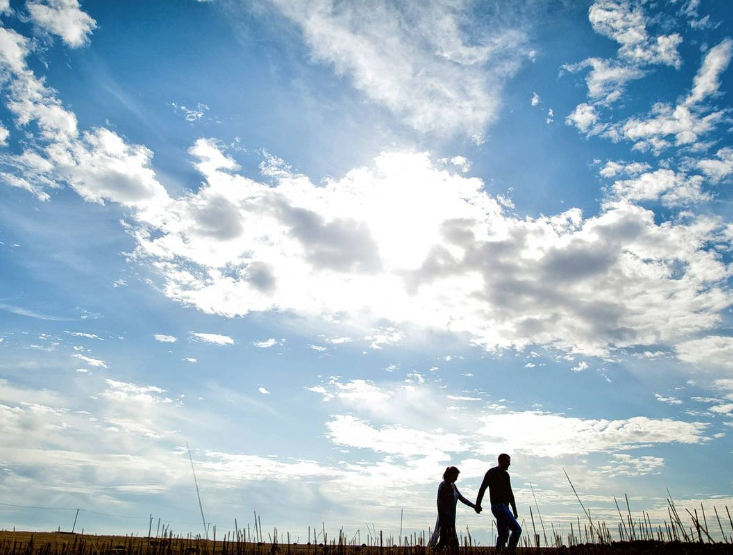 На крыше. Только сами влюбленные, никаких лишних прохожих. Снимки на фоне заката или ясного неба всегда выглядят особенно романтично.