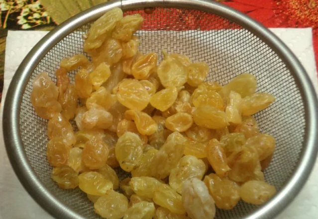 Сливаем воду с изюма и обсушиваем на бумажном полотенце.