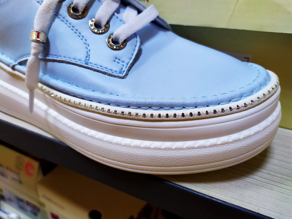 Голубые кожаные туфли на толстой подошве и блестящим кантом по кругу. Цена 2499 рублей.