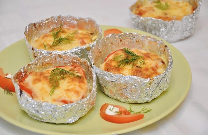 В окончании мы выкладываем помидоры, нарезанные кольцами, посыпаем мелко нарезанным чесноком и натертым сыром.