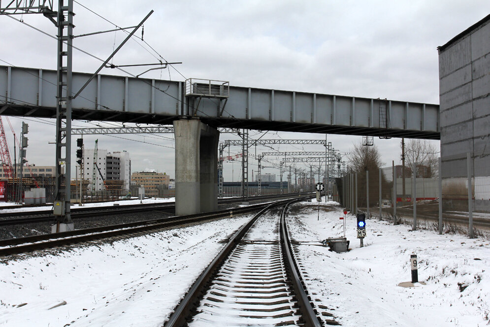 2. Ветвь проходит под путепроводом Остаповского проезда. Кстати сказать, это одни из последних её фото в прежнем виде. Вскоре началась электрификация ветви для пропуска через неё части транзитных поездов из Санкт-Петербурга в южном направлении, которые пока делают остановку на Курском вокзале, а с конца мая сменят прописку на новый транзитный вокзал в Черкизово (Восточный).