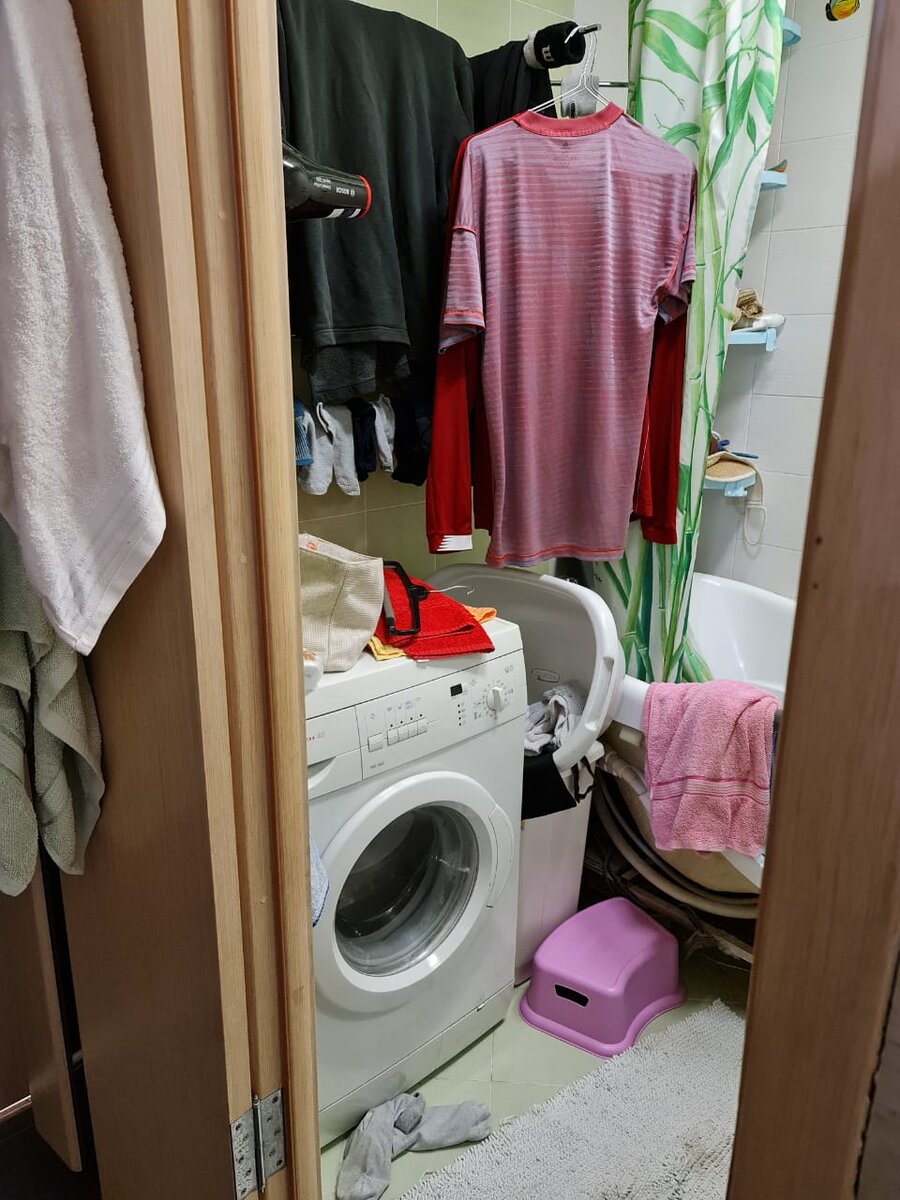 Чтобы не было как на картинке, грязные вещи можно спрятать под стиральную машину или под раковину.