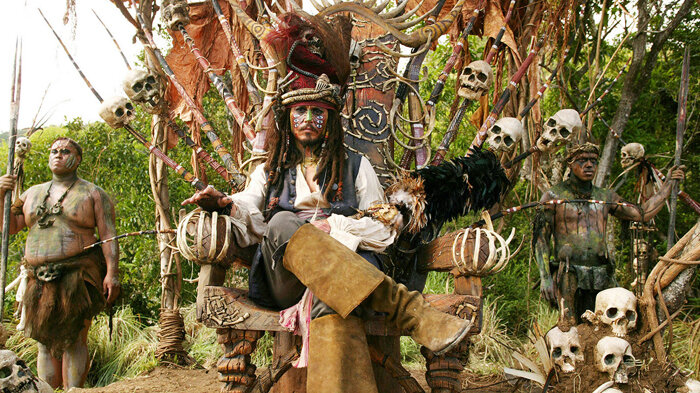 Впечатляет количество и качество трюков. Журналистский штамп «головокружительные каскады» этих самых трюков как нельзя лучше описывает то, что происходило на острове с дикарями и на острове с сундуком. Очень зрелищно и изобретательно.