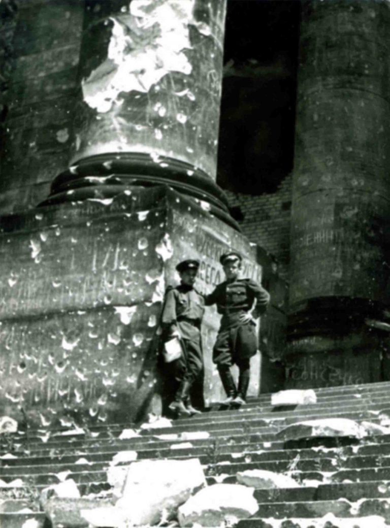Two Soviet officers from the USSR Air Force of Red Army are posing in the heart of the Third Reich – on the steps of the destroyed Reichstag in Berlin.