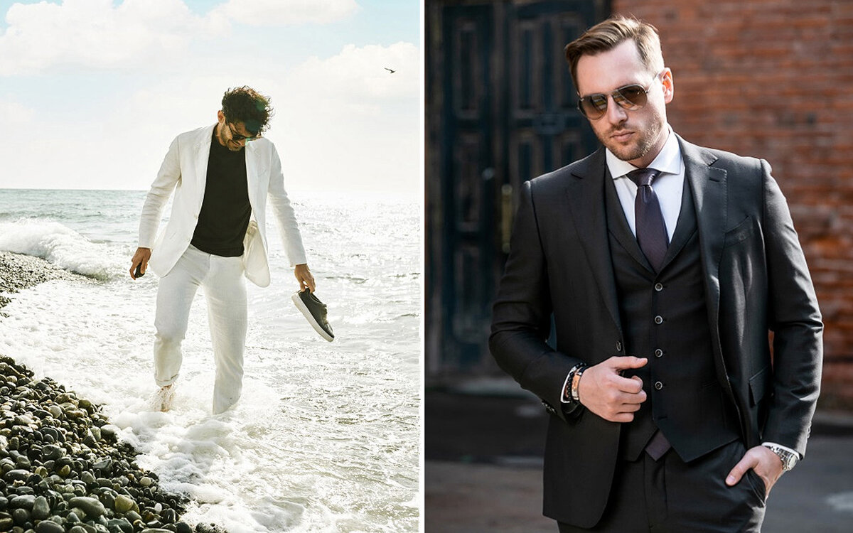 Часто в теплое время года мужчины используют пиджак как верхнюю, уличную одежду, снимая его в помещении. В этом случае образ лучше формировать от брюк. И учесть правила: