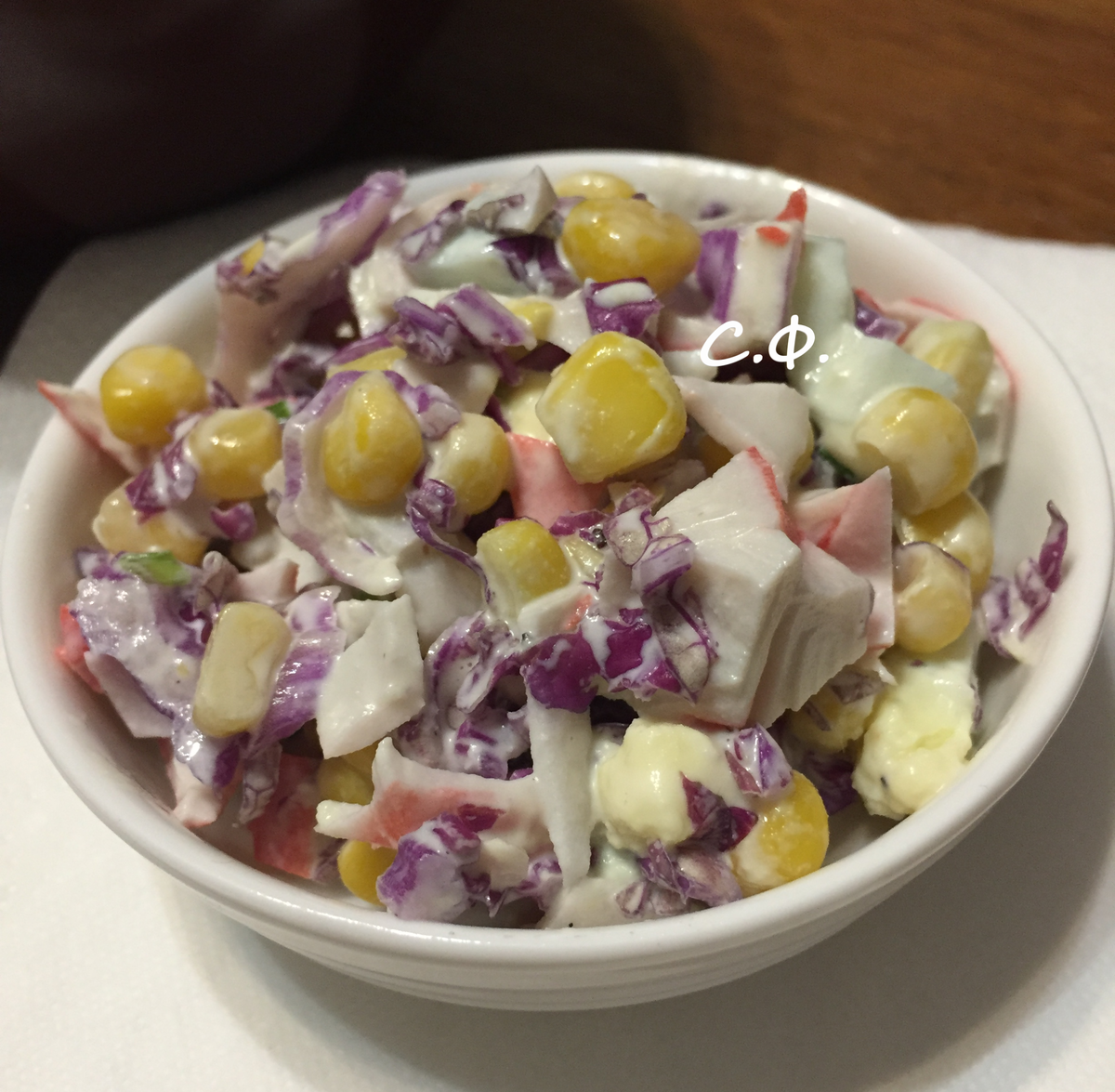 Все соединяем: Крабовые палочки, пекинскую капусту, яйца, кукурузу, репчатый лук и все заправить майонезом. Обязательно посолить, поперчить и добавить зелени.