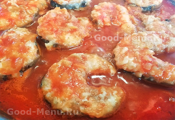 - Когда вкус томатного соуса нас удовлетворит, кладем в него колечки обжаренного хека. Если соус не накрывает рыбу полностью, ничего страшного, просто при помощи ложки поливаем томатом колечки хека.