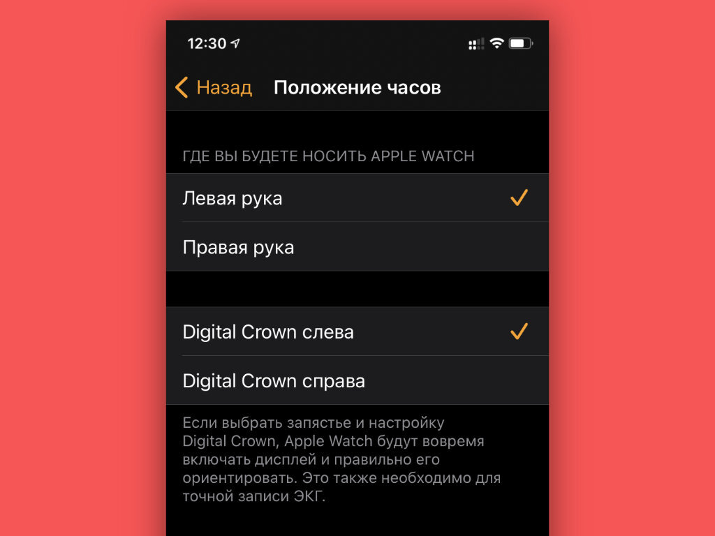 Что сделать: наденьте часы так, чтобы колесико Digital Crown было направлено в сторону от кисти; откройте приложение Watch на iPhone; перейдите в раздел «Основные»; разверните меню «Положение часов»; переключите положение колесика: «Digital Crown слева» или «Digital Crown справа».