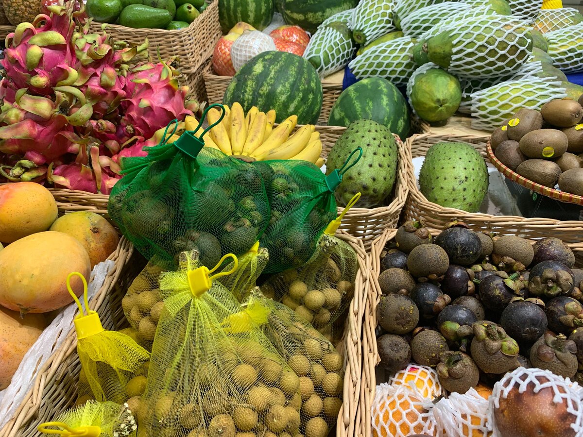Фрукты! В магазинах таких не увидишь и не купишь, а если и купишь то очень за дорого. Манго, гуава, папайя, маракуйя , дуриан, гуанабана. Цена за кг от 500 до 1000 рублей. Не удержались купили манго, там же помыли и почистили, и съели)) запах просто космос ( точнее Азия). Листайте галелерею.