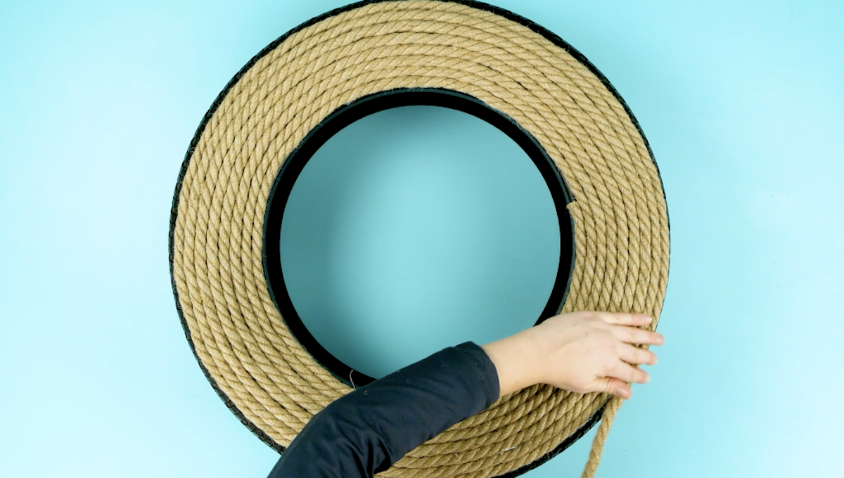 Чтобы сделать потрясающе стильный столик из старых покрышек, для начала хорошенько помоем их и обклеим декоративным шнуром.