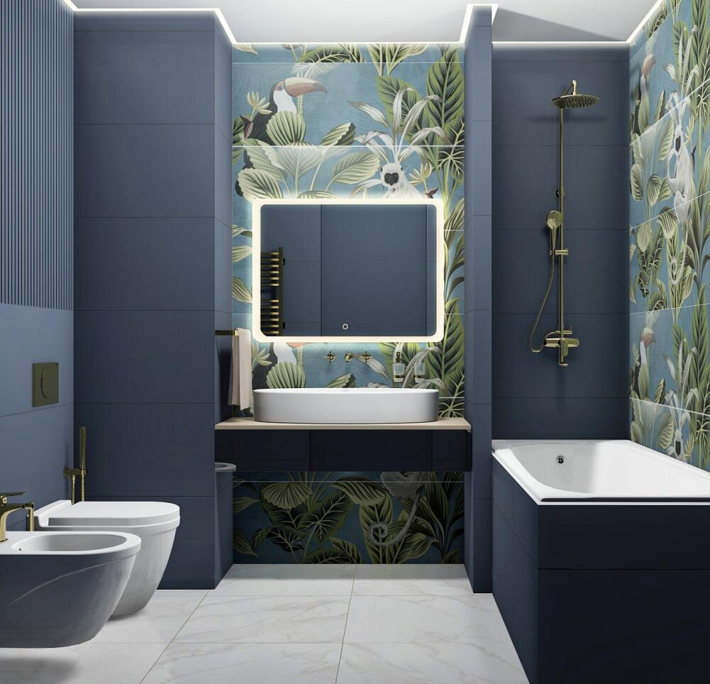 Бронза и тропические мотивы: дизайн-проект санузла в стиле эклектика