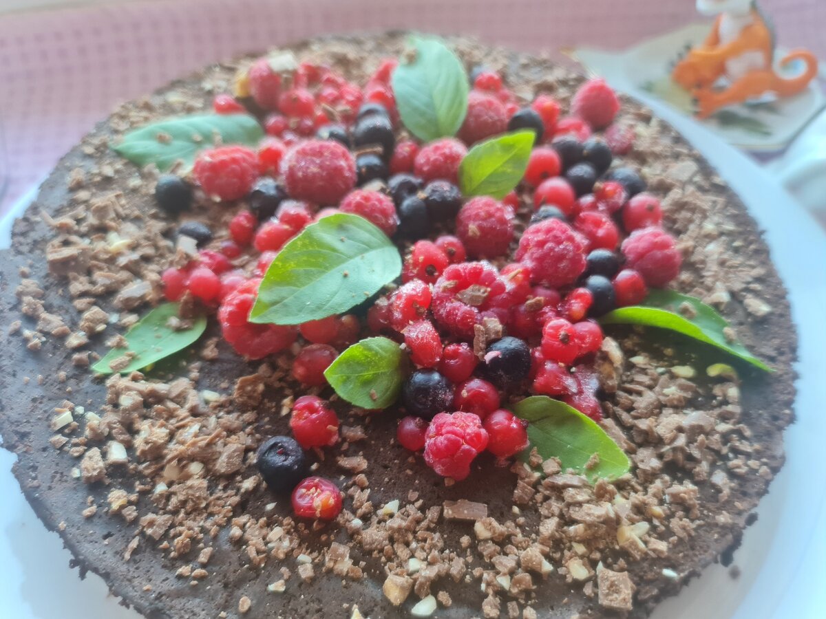 В таком виде отправляем его в холодильник минимум на 8 часов. Перед подачей достаём торт, посыпаем шоколадом, или орехами, или ягодами, а можно просто посыпать какао для тех, кто любит шоколадную горчинку, или полить вареньем тем, кто любит сладкий шоколад с ягодками.