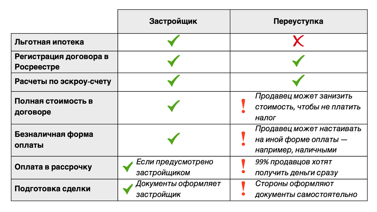 В заключение приводим сравнительную таблицу. Собрали особенности покупки новостройки у застройщика и по переуступке.