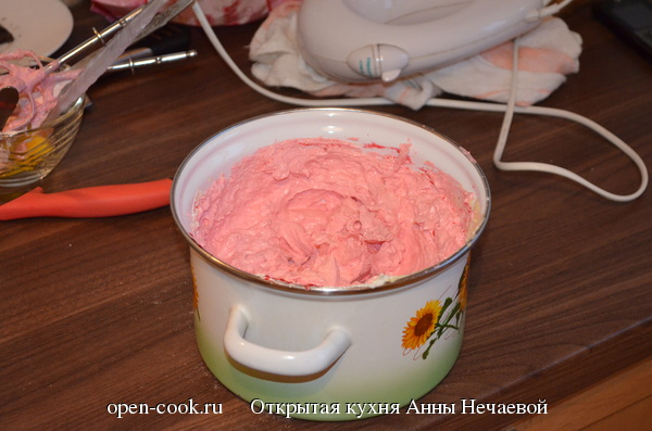 Этот крем был нами сделан для Ruby торта. Он должен был быть красного цвета, но мы использовали не краситель, а клюквенный сок. Краситель просто так не найдешь, потому используем подручные материалы. Получился красивый розовый цвет и чуть кисловатый вкус.