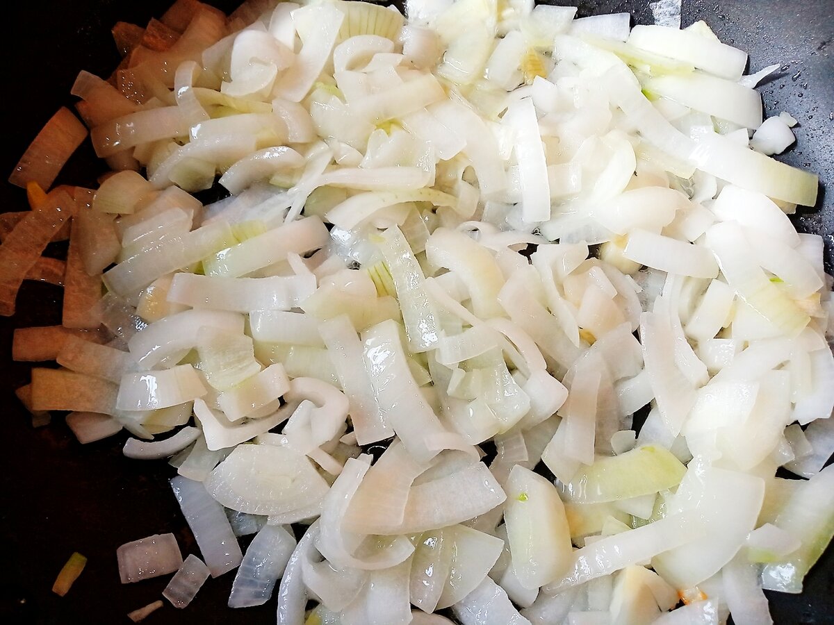 Лук нарезаем на куски произвольной формы и обжариваем на растительном масле, пока он не станет прозрачным.