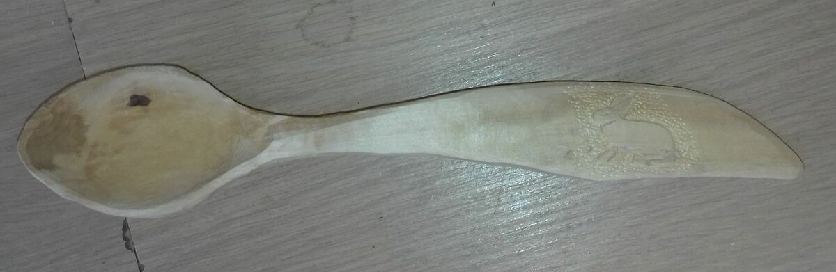 Древесина достаточно сухая, поэтому нет необходимости в промежуточной сушке, можно сразу приступать к резьбе рисунка. Нарисовал сидящего зайца и ножами быстро его вырезал. Решил всё-таки немного выделить фон чеканкой. Ложку решил практически не заполировывать, только немного шкуркой с зерном 150 сверху загладить следы ножа. Ложку решил льняным маслом не покрывать, так как оно даёт желтизну на поверхности. Получилось вот так.