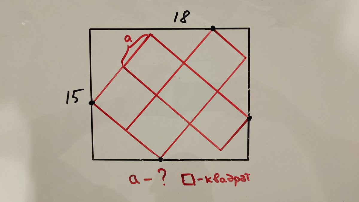 Перед вами черный прямоугольник со сторонами 15 и 18. В него вписана фигура, состоящая из красных квадратов. Нужно найти сторону красного квадрата.