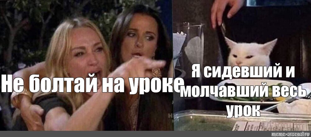 Кот за столом и кричащая девушка - интернет-мем , состоящий из двух картинок. В левой части изображены две возмущенные женщины, одна из которых тычет в кого-то пальцем и орет. На правом фото - белый кот с недовольной и растерянной мордой, сидящий за столом.