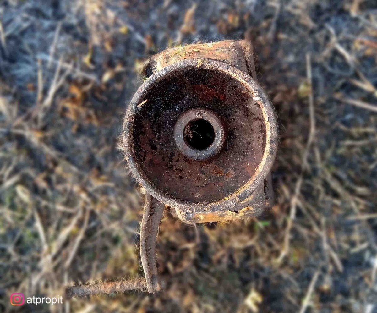Внутри большого фундамента почти на поверхности мы увидели интересный предмет. Такой железный агрегат мы увидели впервые. Каково его назначение, для каких целей он служил, нам не ясно. Внутри этого агрегата имеются шестерни которые приводились в действие кривой ручкой которая находится сбоку этого устройства.
