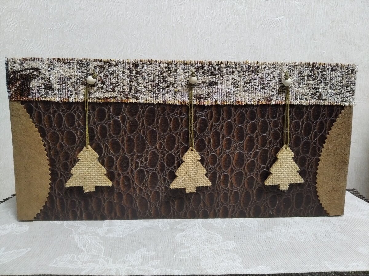 Вариант 1. Здесь большая часть коробки покрыта кожей от небольшого старого чемодана. В качестве отделки использовала кусочки замши и мебельной ткани. Подвесные элементы взяты из набора украшений, сделанных из фанеры. Просто на елочках еще сверху наклеена ткань типа рогожки. А вот остальные элементы из этого набора я наклеила на папку для бумаг (об этом направлении в работе с кожей расскажу немного позже). Можно в любой момент снять или заменить другими. В этой коробке лежат различные инструкции .