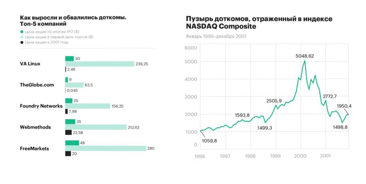 На стыке девяностых и двухтысячных из-за спекуляций и неоправданного оптимизма инвесторы потеряли около $5 трлн. Биржу обрушил взлет убыточных интернет-стартапов.