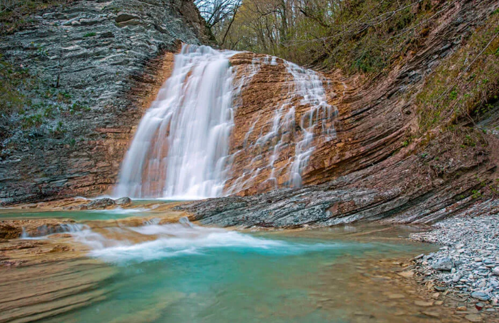 Река Тхаб протекает по скалам в ущелье, напоминающих пирог из нескольких слоев. Протекая через уступы, она разделяется на несколько водопадов - и больших, и поменьше. А в ясную солнечную погоду под струями реки можно увидеть небольшие радуги.