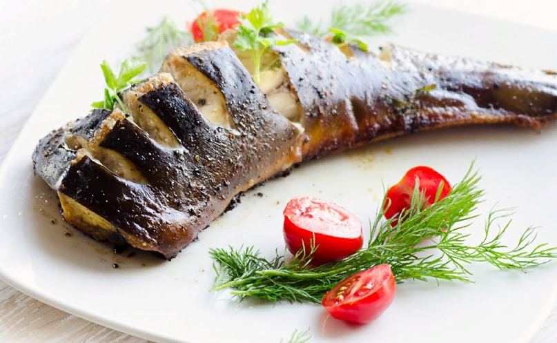 Филе сома нарезать на порционные куски, посолить, обвалять в муке и обжарить на растительном масле.