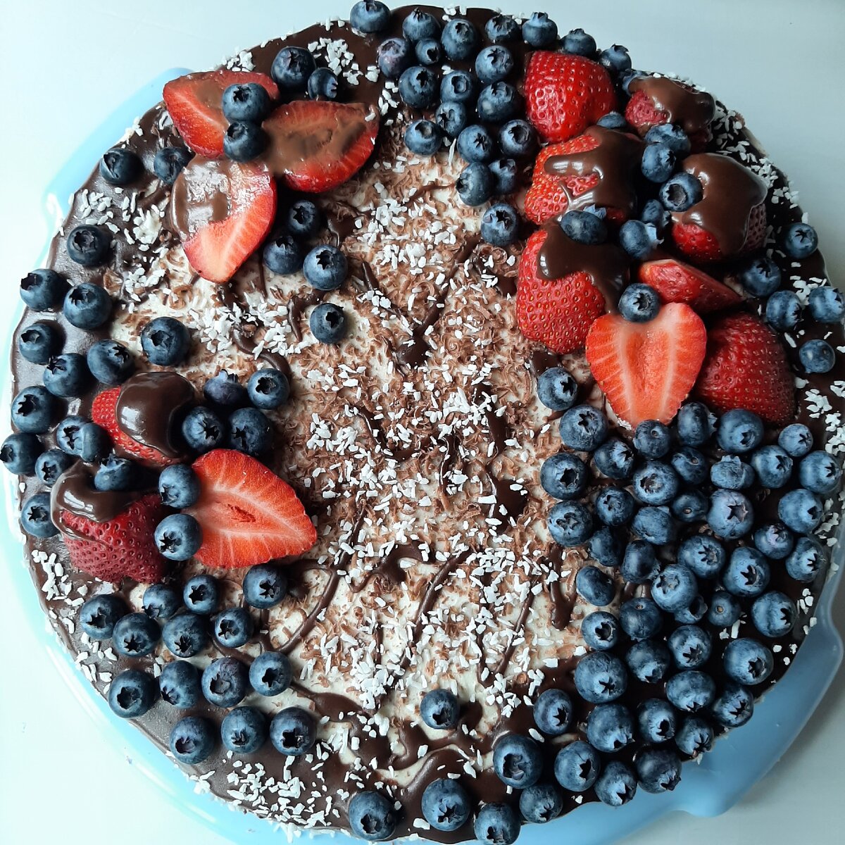 Торт почти готов, остаётся только украсить. Отлично сочетаются с кремом-чиз и шоколадными коржами ягоды голубики и клубники. Также для украшения можно использовать шоколадную глазурь, кокосовую стружку, шоколадную стружку - всё что Вам нравится. Многие украшают с помощью кусочков шоколада, конфетами или печеньем.