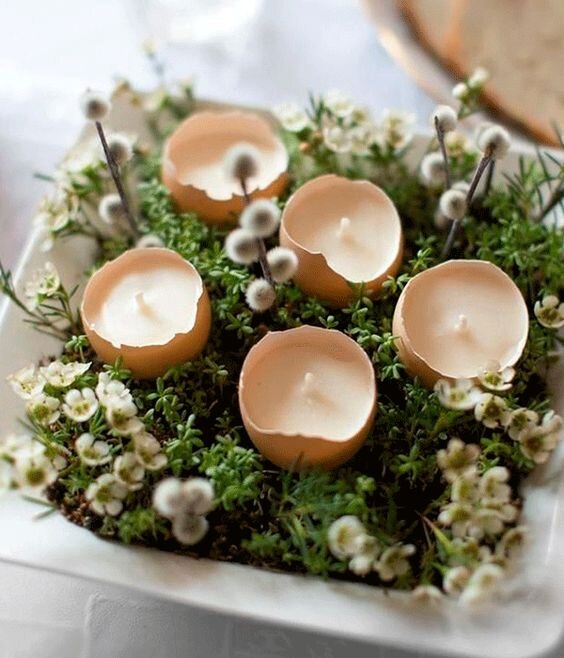 Берем яйцы и аккуратно разбиваем, можно использовать две половинки или открыть яйцо сверху, сформировав скорлупу в виде своеобразной вазочки. Все зависит от вашей задумки и фантазии. Получившиеся части скорлупы заполняем цветами и зеленью или плавим воск и формируем свечки. Получившиеся красивые и максимально простые заготовки помещаем в свободную емкость или тару из под яиц, украшаем мхом, зеленью, веточками, перьями - всем, что легко найти для декора. По желанию скорлупу можно раскрасить, это добавить дополнительных красок вашей композиции.
