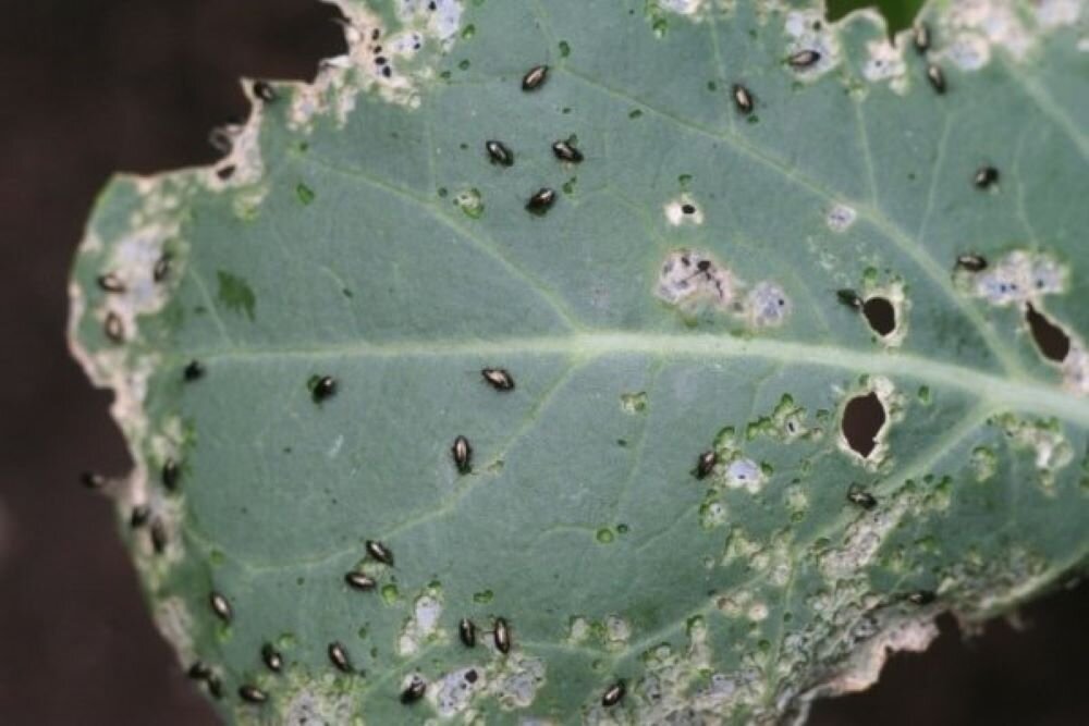 До чего ж крестоцветная блошка любит растения из одноименного с ней семейства. Молодые всходы редиски и репы, редьки и брюквы становятся ее добычей. Но особое лакомство — капустная рассада. Свирепствует блошка больше всего в сухую жаркую погоду. Если не принимать меры, за несколько дней листики будут продырявлены, растения прекратят развитие и могут погибнуть. Самое неприятное, если насекомые доберутся до серединки рассады и уничтожат ее, как бы дальше она не росла — полноценный кочан уже не завяжется.