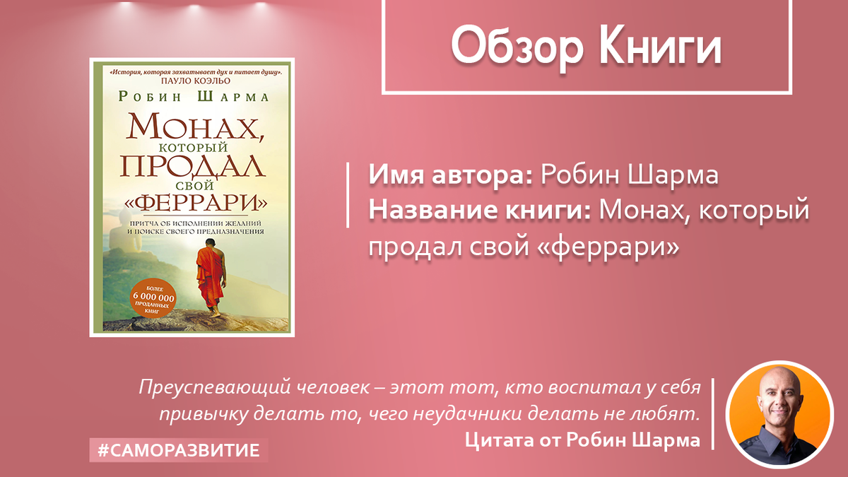 Ставшая бестселлером во многих странах, книга Робина Шармы "Монах, который продал свой феррари" рассказывает нам удивительную историю Джулиана Мэнтала, адвоката - миллионера, которому довелось пережить духовный кризис. Погружение в древнюю культуру изменяет его жизнь. Он открывает для себя действенные, мудрые, духовные правила, которые учат нас: